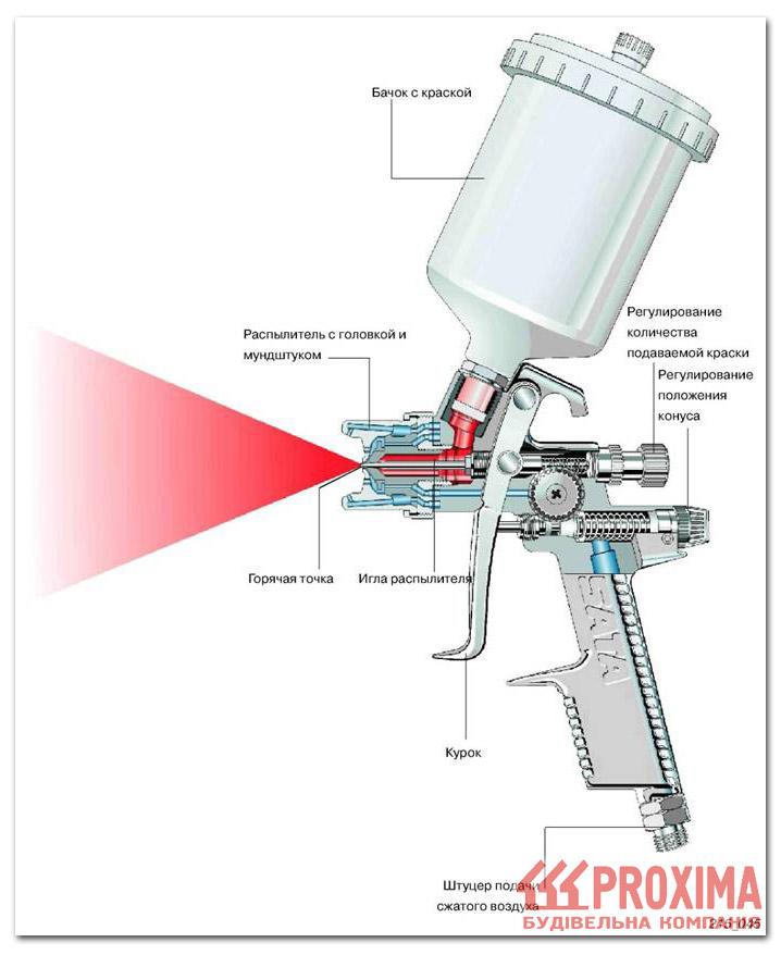 Для получения ровного края окрашиваемой поверхности можно использовать самоклеящуюся ленту, наклеиваемую на заранее отбитую с помощью шнура или отвеса линию. Как только уровень жидкости упадет, емкость нужно наполнить, иначе после всасывания воздуха краскораспылитель выбросит неконтролируемое количество краски.